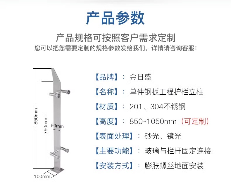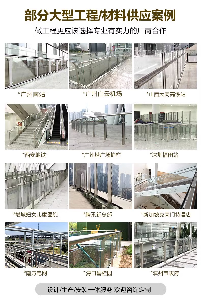 此物料为建筑工程护栏立柱,一次被市政建设府,髙铁站,无人候机楼,超商,中大型商家集中采购。难度高,耐磨性损,耐侵蚀,颜色好。加厚价格托架更多结识坚固耐用,圆棒玻璃板夹布置快捷